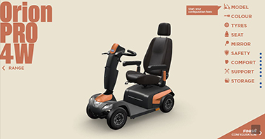 It couldn’t be easier - within the visualiser, the on-line tool will show a scooter image, either Comet or Orion. Once your model of choice is selected, a series of clear pictures guides you through the customisation options. Each selection or option added is instantly updated live on screen. The tool will even tell you if a combination of options is not compatible. When complete your Scooter design can be saved. Or you can choose to e-mail it directly to a friend or family member or your local Invacare retailer. You can even share on Facebook, Twitter or Instagram.